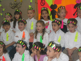 At the gan party of one of our older children, the construction-paper candle pinned to a girl’s shirt (similar to that in the picture above) caught fire from the real candle she was holding. Fortunately, the girl (and the rest of us) escaped and only her shirt was damaged. It’s madness to let four-year-olds walk around a crowded gan with lit candles. During the party last week, the children placed their unlit candles (tea lights mounted on a decorated CD) on the poster, and the staff lit them afterward. So while I think candles in gan should be banned, we have progress.