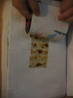 For rachtzah, the second hand-washing of the seder, we have another hand-print. A second piece of matzah paper stands in for the mitzvah of matzah.